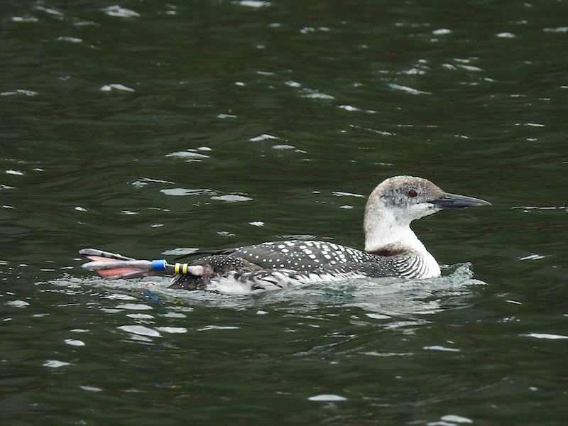 The loons of Lake Jocassee don’t look like the Common Loons we know from summer in the Northwoods because they are in the middle of molting from winter brown to their snazzy summer tuxedoes. However, this particular loon was captured on Lake Jocassee in the winter, and outfitted with colored leg bands. Then he was spotted again last summer in Minnesota! Long-term research on the behavior of individual loons has been essential in advancing our understanding of their lives and conservation needs. Photo by Emily Stone.