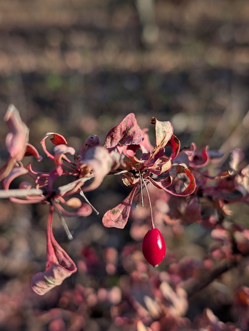 I was happy that we’d found and taken care of this one barberry bush before it spread too far and impacted the diversity and tick population of this lovely forest. November is a good time to get outside and spot the rosy shrubs when everything else is gray. On the way back to the house the only other flash of red I spotted was a cardinal heading toward the bird feeders. That’s a bit of color I’m excited to see.
