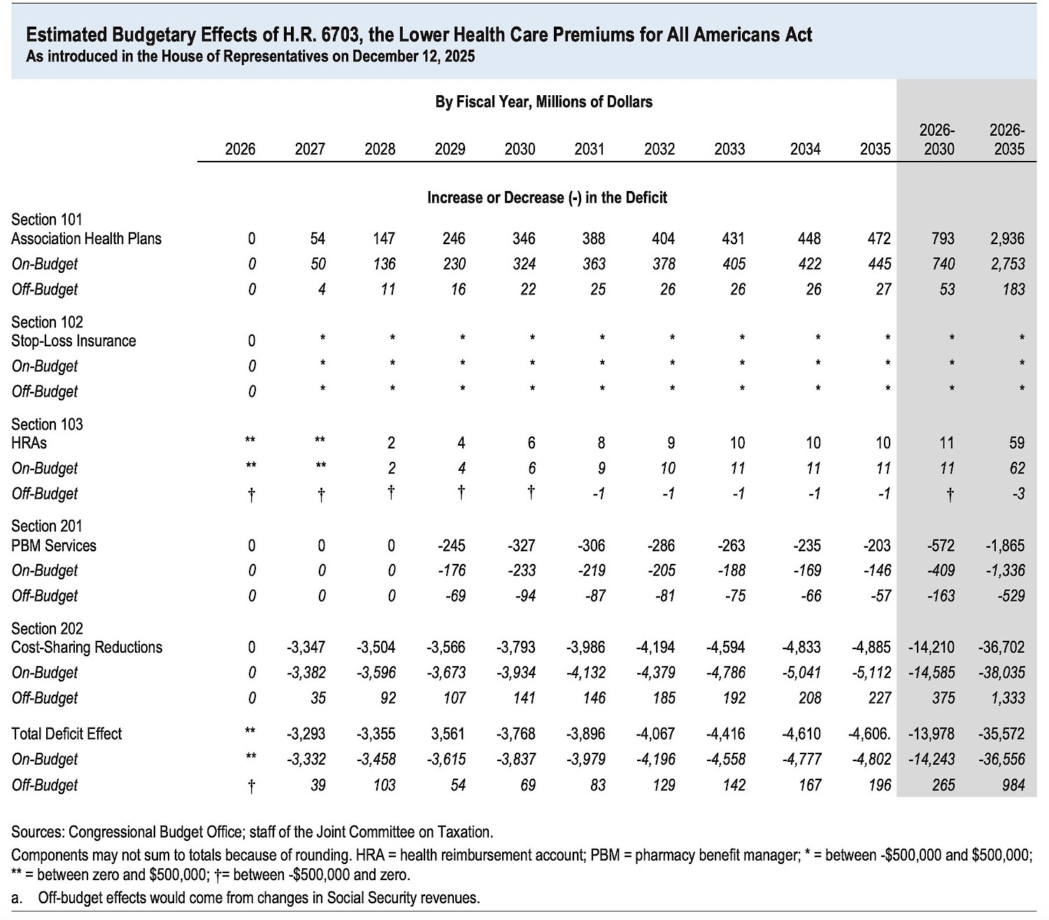 - Lowers Premium Costs: According to the Congressional Budget Office (CBO) cost estimate, enacting H.R. 6703 would reduce the deficit by $35.6 billion over the 2026-2035 budget window. Additionally, CBO estimates this bill would reduce gross benchmark premiums by 11 percent.